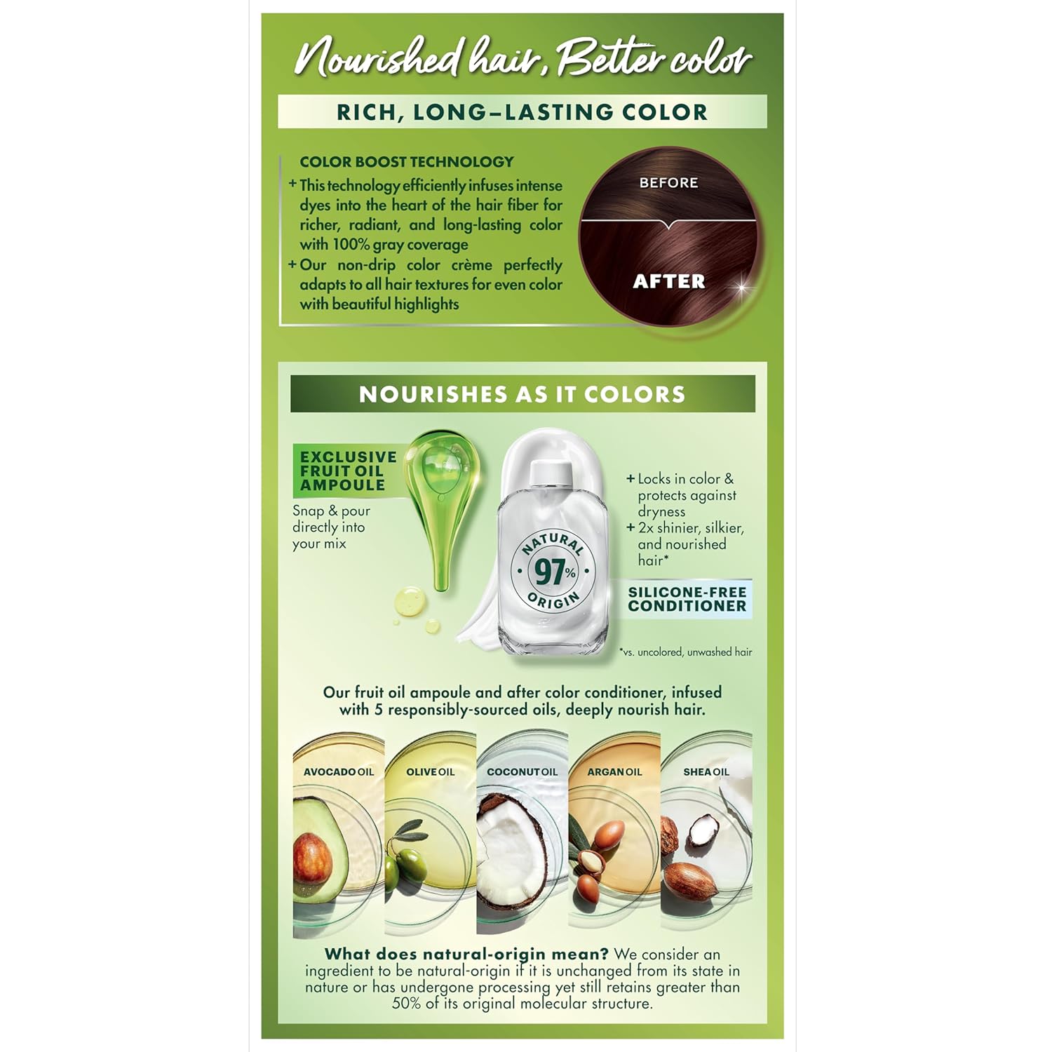 - Hair Dye Kit: The only hair color with a separate fruit oil ampoule that you snap & pour directly into the mix; Follow hair dye with our after color hair conditioner, infused with a blend of 5 fruit oils: avocado, olive, shea, argan & coconut oil