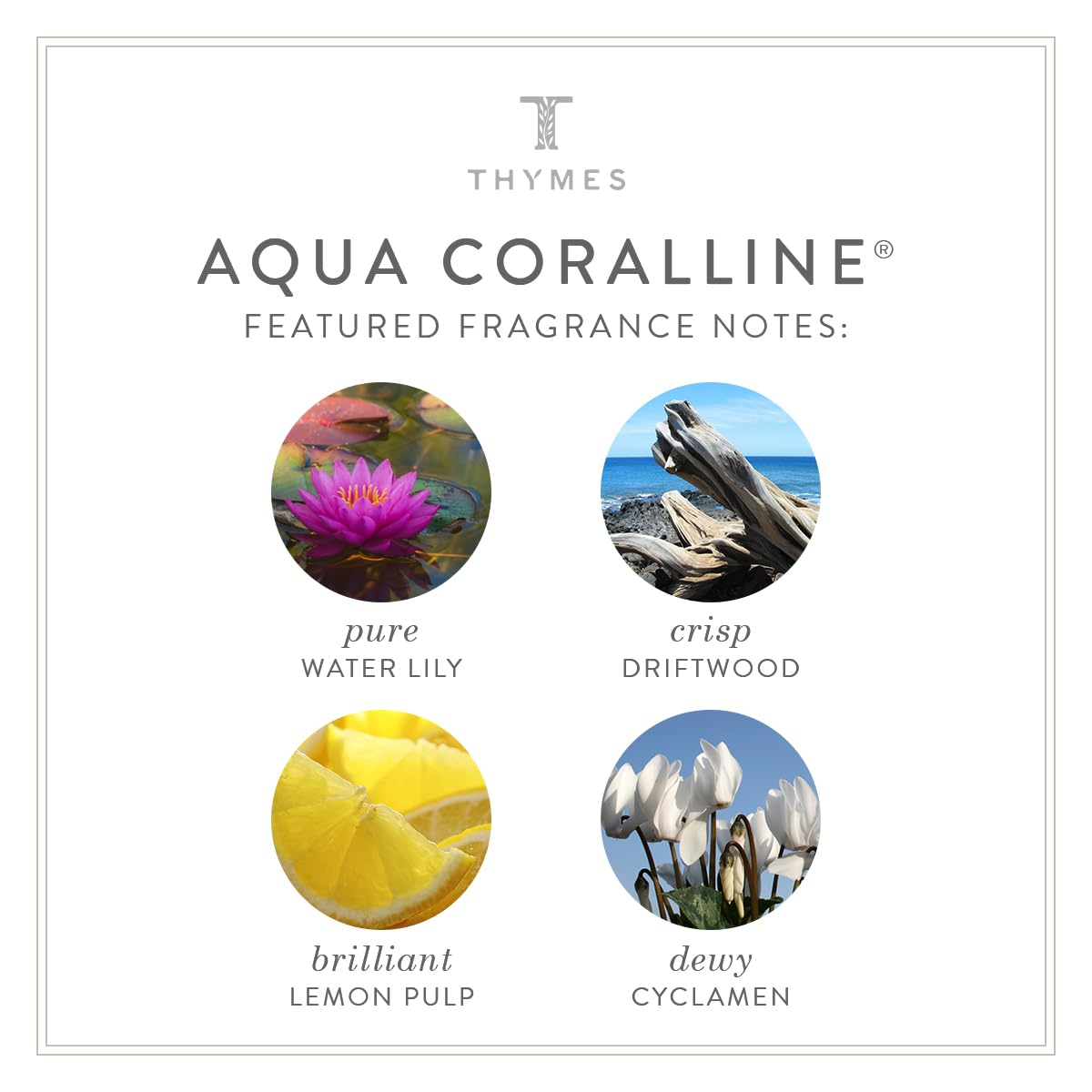 - Fragrance Details: Aqua Coralline - Pure water lily. Dewy white cyclamen. Crisp driftwood. Tart yuzu. Brilliant lemon pulp. Intriguing bamboo.