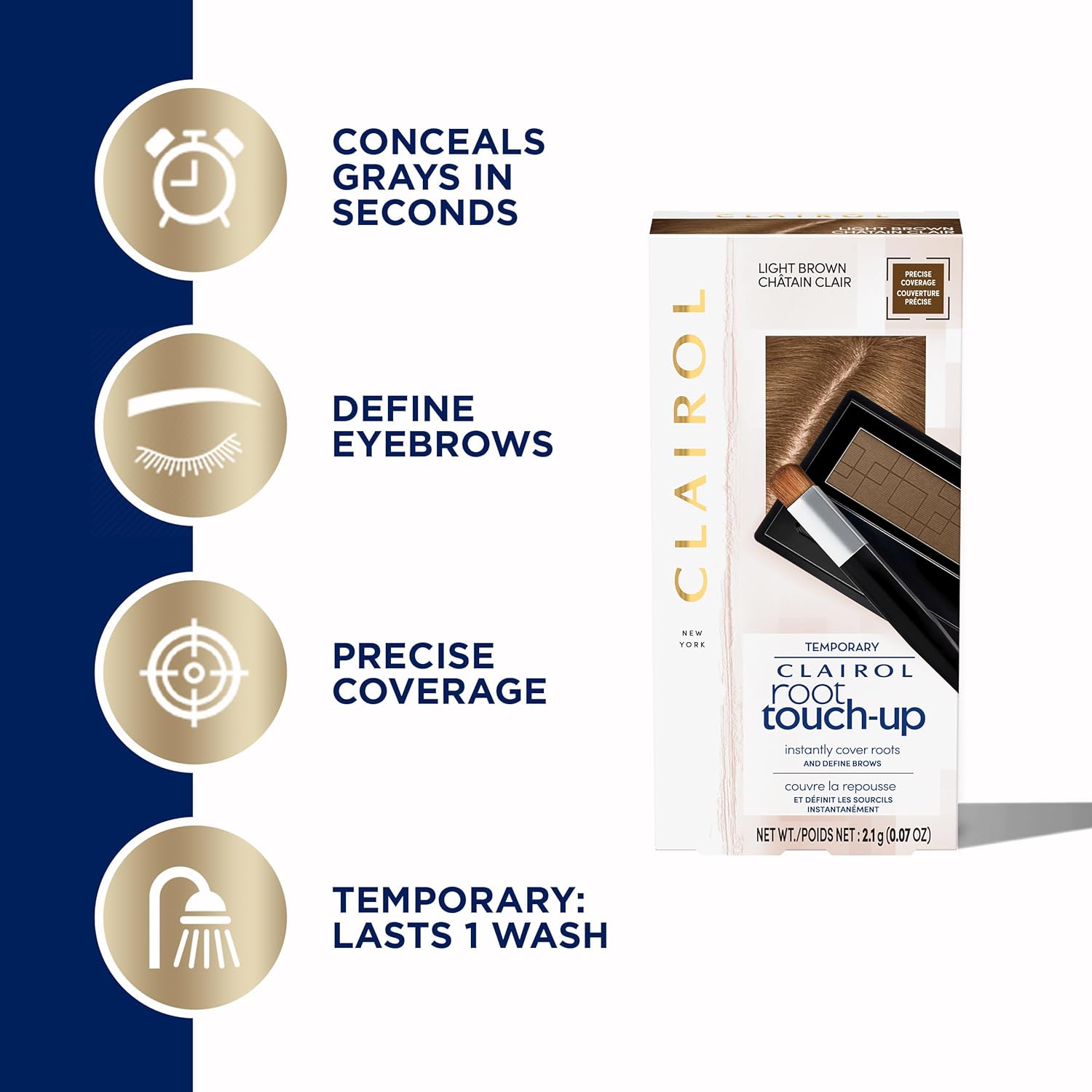 - Use it to cover single strands, touch up your temples, refresh your root line, or even define your brows