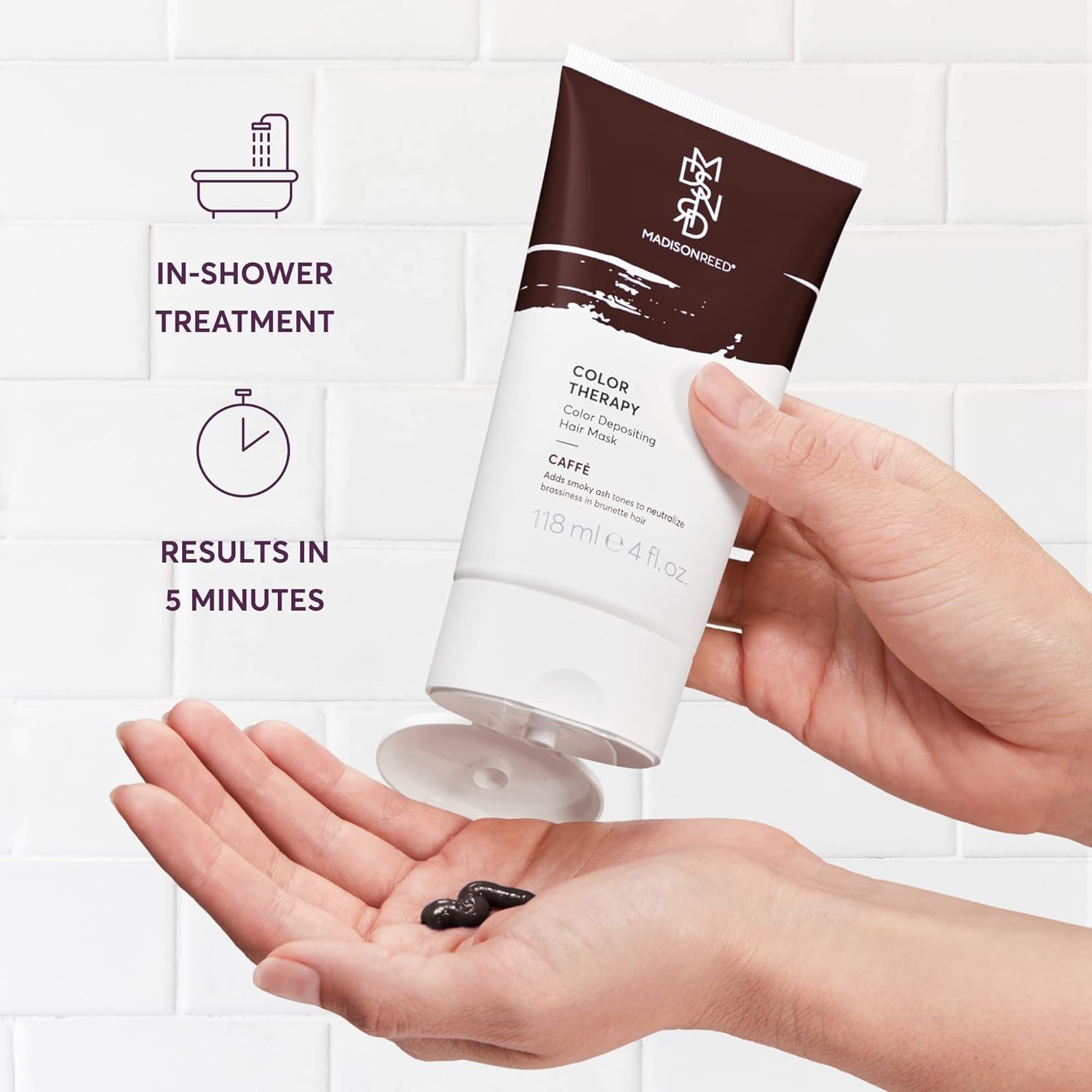 - COLOR DEPOSITING HAIR MASK: Madison Reed Color Therapy in Caffé works best on light to dark brown hair, as well as rich chocolate brunettes, and adds smoky ash tones to neutralize brassiness and unwanted orange & red tones. Not intended for gray coverage.