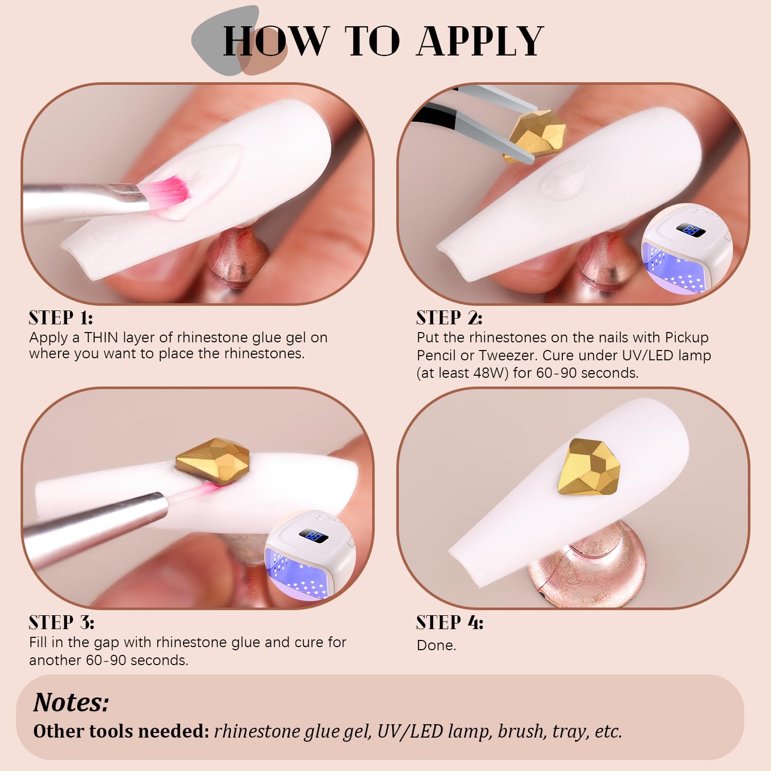 - 💎EASY TO USE -- Easy to apply on artificial nails. After applying nail polish and applying enough gel on the nails, simply use the equipped tools (pickup pen + tweezers) to pick up the crystals onto your nails to create your fabulous DIY designs! These crystals gemstones are different from those hotfix stones, they are not self-adhesive, you have to apply glue to stick them (glue is not included.)