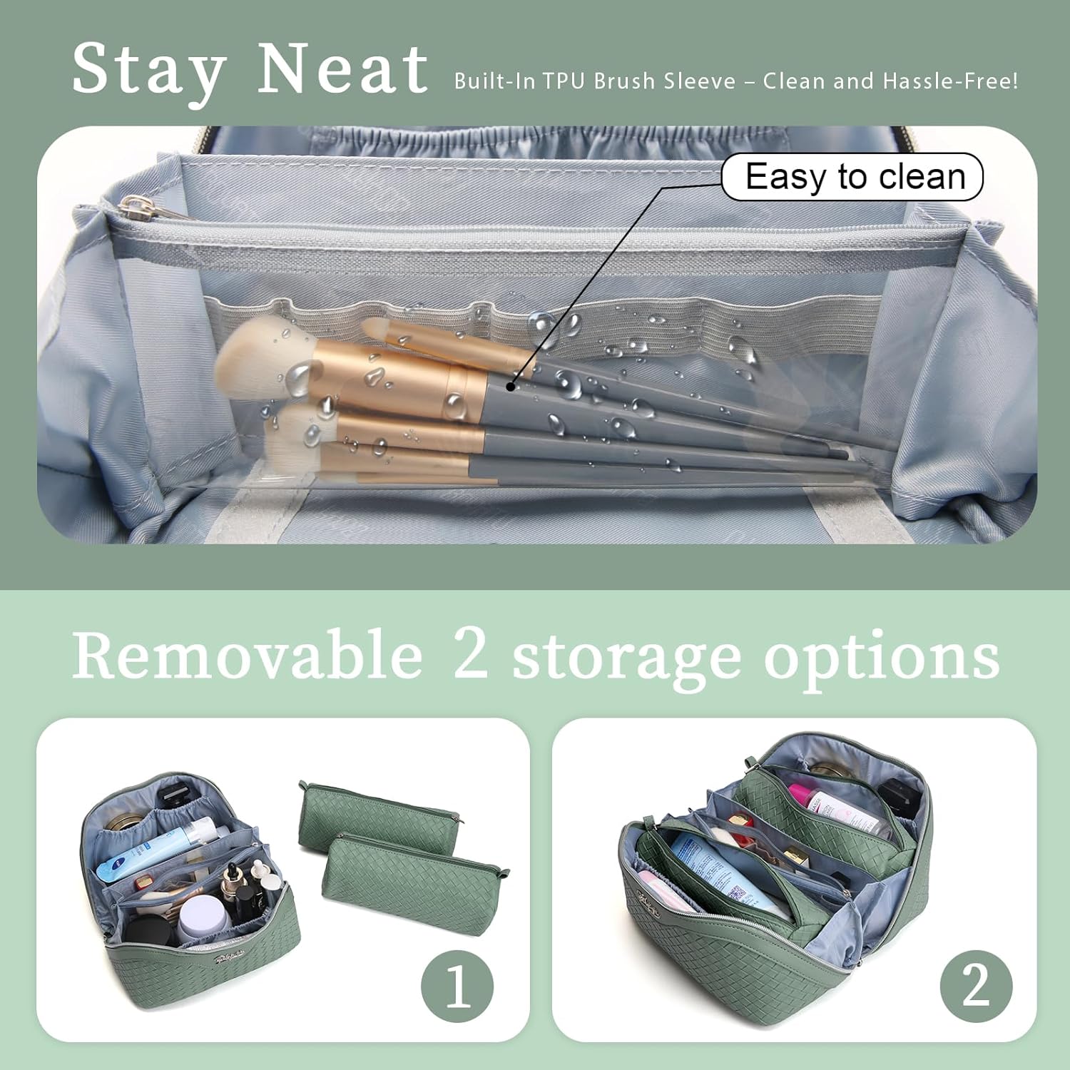 - With Two Small Cosmetic Bag: This makeup bag for vacation comes with two small cosmetic bag,which can organize your brush or other small things More easily.