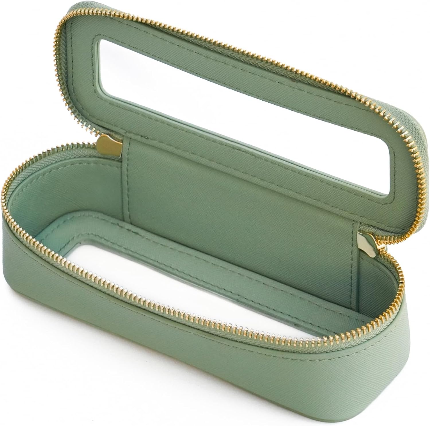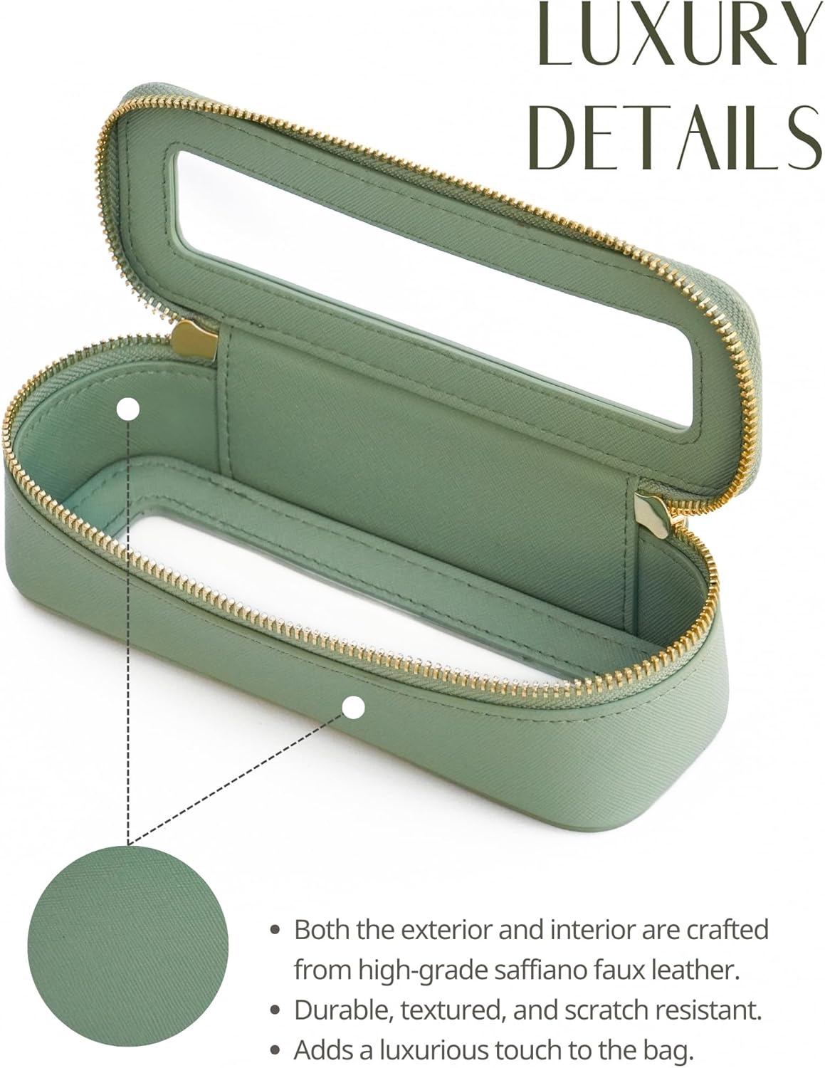 - [Premium Quality] - This clear cosmetic case is crafted from high-grade saffiano faux leather, making it highly scratch-resistant, durable, and easy to clean. It features a smooth zipper for secure closure and elegant light gold metal accents for a luxurious touch.