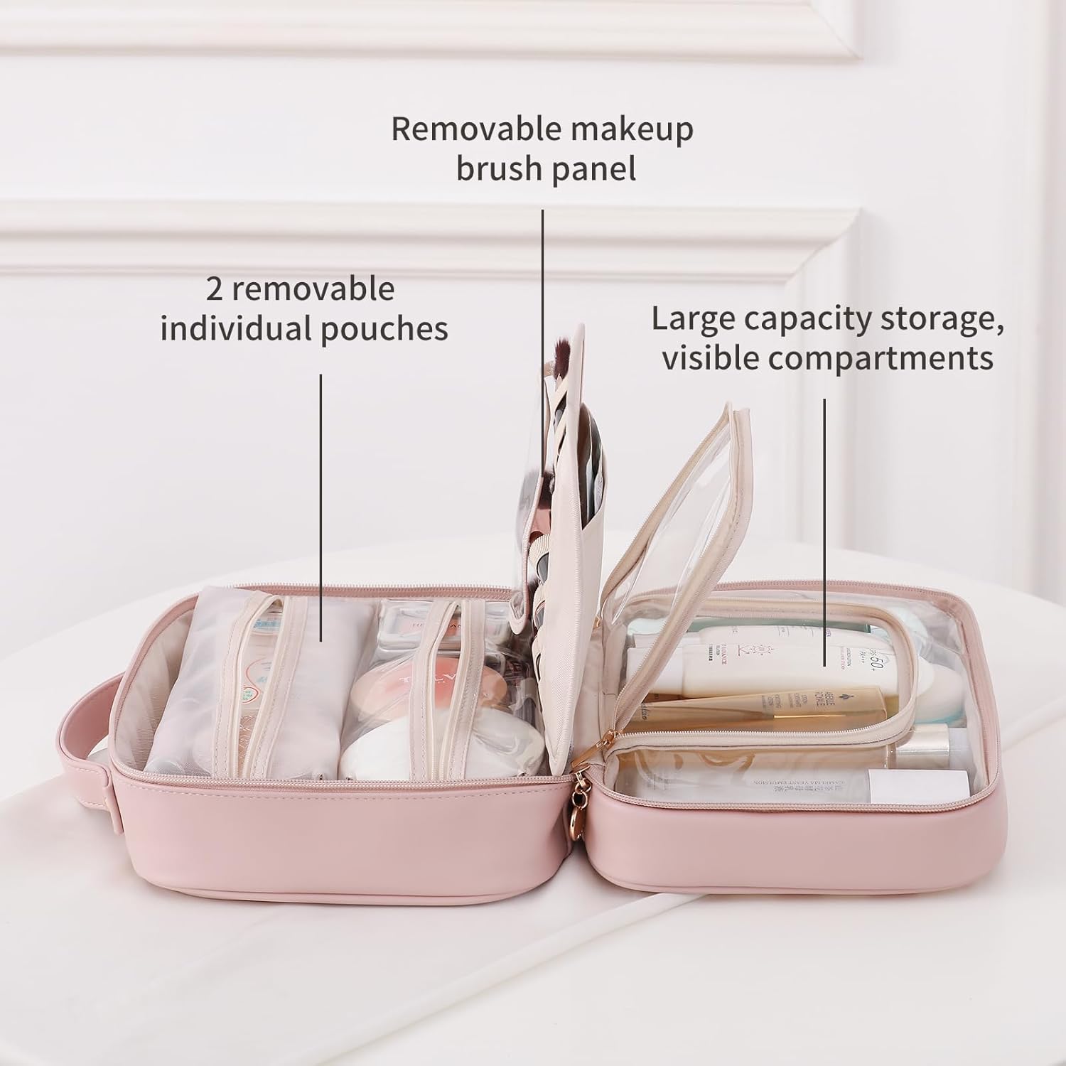 • Removable Compartments:In addition to 1 large compartment, it also includes 2 removable transparent dividers and 1 removable makeup brush panel with Velcro fastening. The individual pouches can be used as standalone clear cosmetic organizers