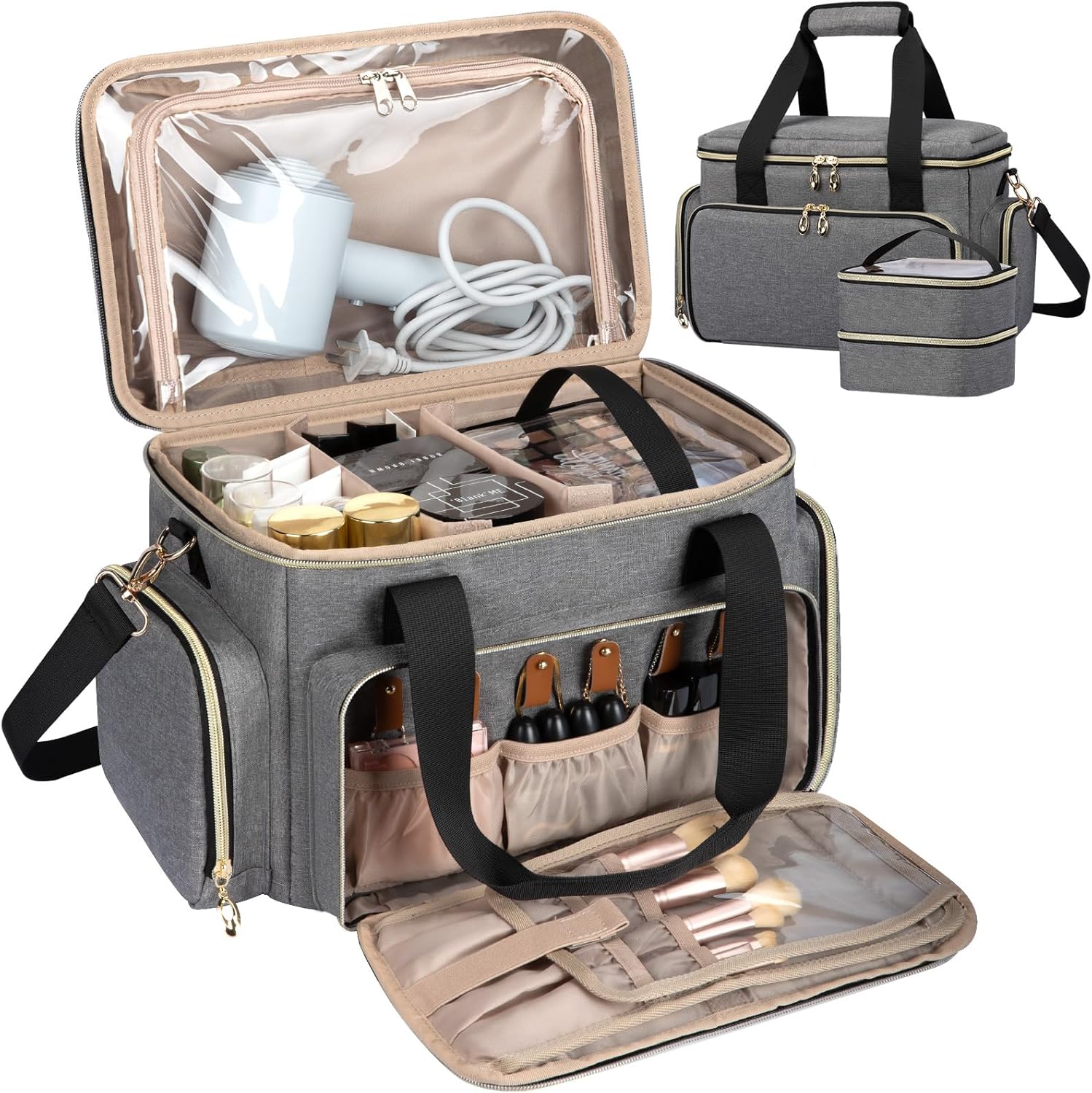 Large Makeup Bag, Portable Travel Makeup Bag Organizer for Women Girls with 2 Removable Pouches & Detachable Dividers, Cosmetic Travel Bag, Toiletry Bag for Makeup and Hair Supplies Grey